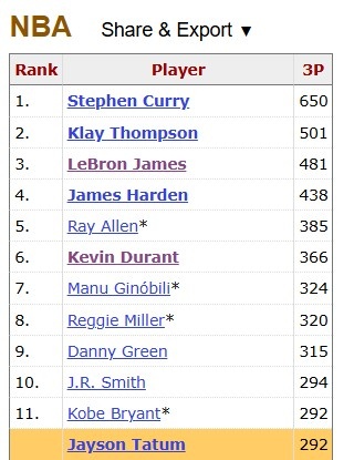 凭借这个三分,塔图姆生涯季后赛三分命中数达到293记,超越科比独占NBA历史第11位。